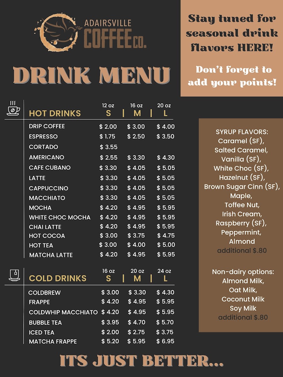 Welcome to Adairsville Coffee Co, a charming coffee haven nestled at 6365 Joe Frank Harris Pkwy NW in Adairsville, GA. This delightful spot has quickly become a favorite among locals and travelers alike, offering an inviting atmosphere with soft classic rock melodies and unique decor, including swings hanging from the ceiling.